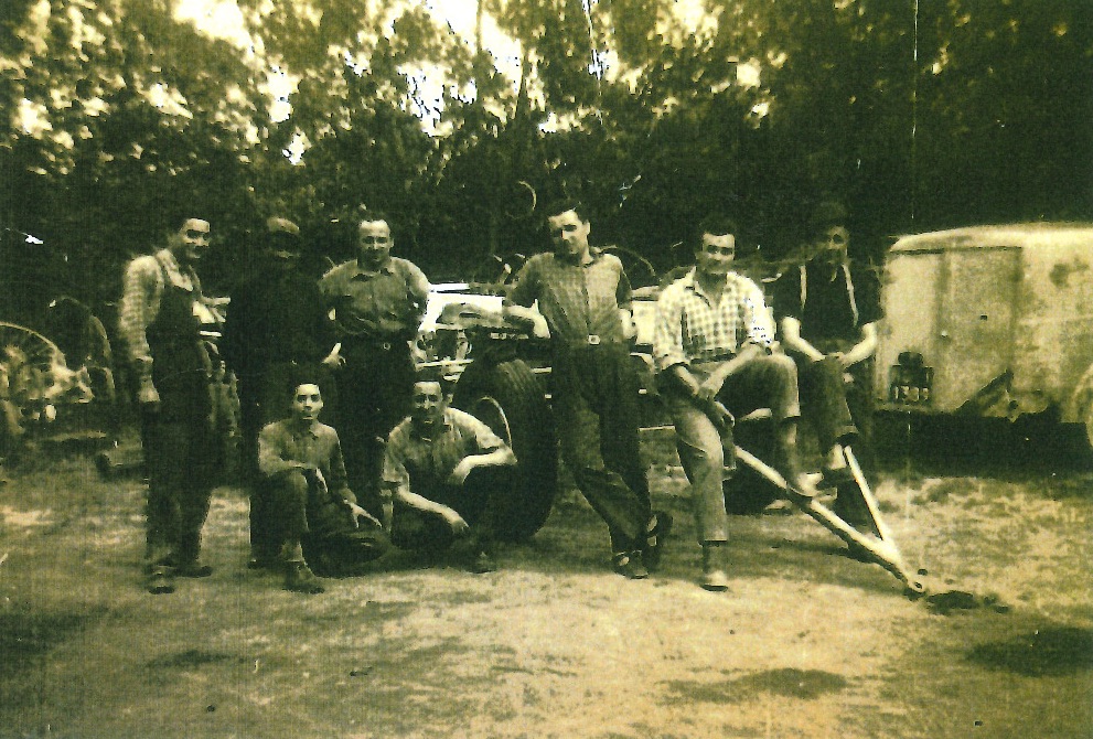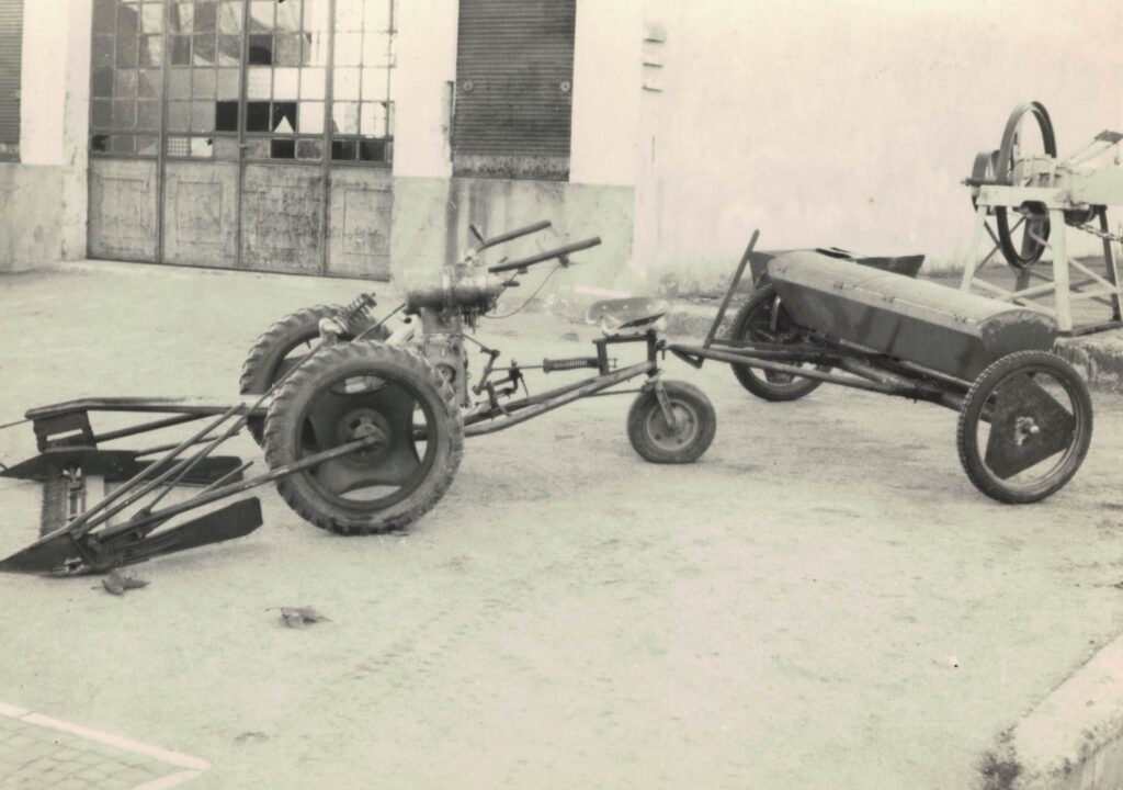 Il periodo tra la fine degli anni Trenta e la prima metà del decennio successivo fu piuttosto difficile a causa della morte di Pasquale e delle difficoltà economiche in cui si trovò l’azienda, dovute alla svalutazione della lira e alla crisi provocata dal crollo della Borsa di New York (1929). Grazie ad un preliminare di compravendita è possibile constatare un passaggio fondamentale di queste vicende. Infatti, dopo aver perso la proprietà dell’azienda e dello stabile nel 1937, i fratelli Antonio, Bruno, Porfirio, Romenio, Pietro Danilo e Luigi riuscirono a riacquistarle tra il 1942 e il 1943. Dall’atto è possibile inoltre conoscere l’articolazione dell’immobile. Questo comprendeva casa, fienile, stalla trasformata in officina, rimessa, terreni e aia. In quegli anni assai funesti, i fratelli continuarono un’attività anche in qualità di terzisti grazie all’acquisto di due sgranatoi, entrambi presenti nelle due foto qui sopra del 1939 e del 1941 (d’altronde le mietitrebbie sarebbero arrivate solo alla fine degli anni Cinquanta), cui affiancarono la riparazione, l’acquisto e il noleggio di macchine agricole. Nonostante le difficoltà, l’azienda contava tre o quattro dipendenti, poiché i fratelli erano in gran parte richiamati in guerra. Fu solo tra il 1946 e il 1947, all’indomani del conflitto, che grazie all’acquisto di alcune segatrici (pur non potendole comprare riuscirono a concordare la spesa con la ditta Granchi di Sermide, che le aveva in vendita, dando in seguito la somma dovuta), l’attività dei fratelli riprese vigore. L’azienda intensificò i lavori per conto terzi (seminatrici, rastrelli, sgranatura del mais) e iniziò a produrre macchine agricole. Alla fine degli anni Quaranta, con la creazione di uno spandiconcime legato alla diffusione della calciocianamide, i fratelli cominciarono a partecipare alle fiere agricole di Bovolone, Verona e dei paesi limitrofi. La ripresa dell’attività fu inoltre spinta anche dal più ampio contesto storico. Durante i primi anni del secondo dopoguerra stavano giungendo aiuti internazionali che si concretizzarono nel Piano Marshall (1948-1953). Oltre ciò, l’area adiacente al fiume Adige delle province di Verona e Rovigo venne destinata alla coltivazione delle patate, con l’obiettivo di aumentare la produzione agricola che subito dopo il conflitto mondiale scarseggiava. La vicenda della famiglia Spedo si inserì in tale contesto. La ditta cominciò a rispondere alle crescenti esigenze di mercato producendo anche macchine agricole dedicate alla raccolta delle patate.