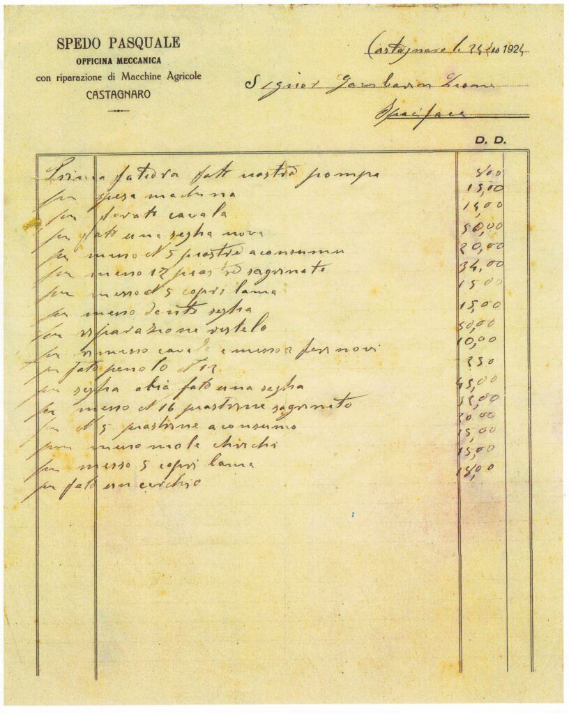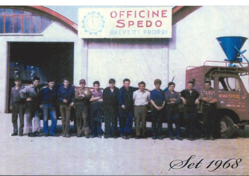 Le vicende legate a questa ditta affondano le proprie radici nelle attività che la famiglia Spedo svolgeva tra la fine del XIX e la fine del XX secolo. Si hanno infatti notizie di essa a partire dalla generazione di Pasquale (1803-1886) – e di un certo Francesco, sposato con Cavallaro Giovanna, papà di Pasquale e assessore comunale di Castagnaro nel 1875 – padre di Antonio (1849-1912), soprannominato morin, sposato con Diletta Arellaro, detta “Isa”, ossia Isabella. Furono questi ultimi a dare alla luce la generazione di Evaristo (1875), Dionigi (1881) e Pasquale (1887-1935). Costoro svolgevano, rispettivamente, i mestieri di falegname, contadino e fabbro: non a caso, fu proprio Pasquale a dar vita all’azienda. Tra i suoi figli Maria (1911), Teresina (1913), Antonio (1915), Luigi (1916), Porfirio (1919), Bruno (1921), Agnese (1923), Romenio (1926), Pietro detto “Danilo” (1929) e Irma (1930), Antonio e Pietro Danilo furono i fondatori delle due aziende tutt’oggi presenti, rispettivamente, a Badia Polesine e a Castagnaro. Sebbene l’attività della famiglia Spedo risalga al XIX secolo, il primo documento ufficiale della ditta è un preventivo del 24 febbraio 1924. Le attività svolte dall’impresa, probabilmente nata in precedenza e di proprietà di Pasquale (1887-1935) – che svolgeva il mestiere di fabbro – sono chiarite dall’intestazione “Spedo Pasquale officina meccanica con riparazione di Macchine Agricole”. Da una breve lettura si comprende come la ditta svolgesse attività produttive (come la produzione di nastri per pompe o di una segha nuova) e di manutenzione (come la riparazione di un restelo, l’antico rastrello mobile per la raccolta del fieno effettuata dopo gli sfalci). Questa tipologia di attività rende evidente come l’origine della ditta fosse strettamente legata al lavoro di fabbro svolto da Pasquale. L’ubicazione della ditta fino al 1952 corrispondeva all’abitazione della famiglia e si componeva di un fienile e dell’aia, ma anche di una stalla, adibita poi ad officina.